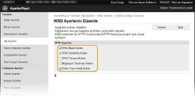 İşletim paneli ile makineyi çalıştırarak WSD taramayı kullanmak için onay kutusunu seçin. Bu onay kutusu yalnızca [WSD Tarama Kullan] onay kutusu seçildiğinde seçilebilir. Tarama yapmak için Ana Ekran'da <Tarama> öğesini seçin ve tarama hedefi olarak WSD-bağlantılı bir bilgisayar belirtin (Tarama ve Bilgisayara Kaydetme).