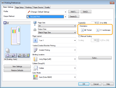 Sürücünün [Basic Settings] ekranında, [Orientation] seçeneğini adım 1'de seçilen yöne göre ayarlayın.
