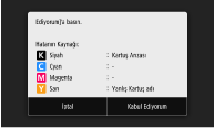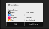 Kalan toner miktarıyla ilgili bilgiler düzgün bir şekilde algılanamıyor. Canon ürünü olmayan ya da adı yanlış olan bir bir toner kartuşu takılı olabilir. Bu kartuşu kullanmak [Kabul Ediyorum]'a basın. Hatanın Kaynağı