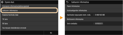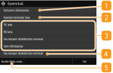 <Egoera-kud.> hautatuz gero, dokumentuen egoera begiratzeko aukera ematen dizun pantaila bat bistaratuko da eta baita makinaren egoera (toner-kartutxoetan gelditzen den kantitatea, etab.) eta makinaren IP helbidea bezalako sarearen ezarpenei buruzko informazioa ere.