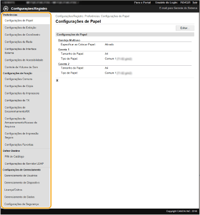 Pode alterar as diferentes definições da máquina utilizando a UI Remota. A maioria das definições também pode ser configurada na máquina, mas algumas definições só podem ser configuradas utilizando a UI Remota. Esta secção descreve o fluxo básico de alteração das definições da máquina utilizando a UI Remota.