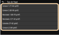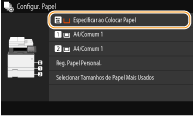 Após o registo da predefinição de papel, o ecrã de definição de papel não aparece quando o papel é colocado e é utilizada sempre a mesma definição. Se colocar um tamanho ou um tipo diferente de papel sem alterar as definições de papel, a máquina pode não imprimir corretamente. Para evitar esse problema, selecione <Especificar ao Colocar Papel> no passo 3 e depois coloque o papel.