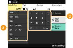 Pode ampliar ou reduzir cópias utilizando um rácio de cópia predefinido, como <A5->A4>, ou definindo um rácio de cópia personalizado em incrementos de 1%.
