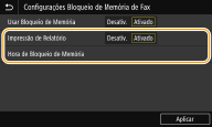 Para imprimir documentos recebidos na memória, defina <Usar Bloqueio de Memória> para <Desativ.>. Todos os documentos guardados na memória são impressos.