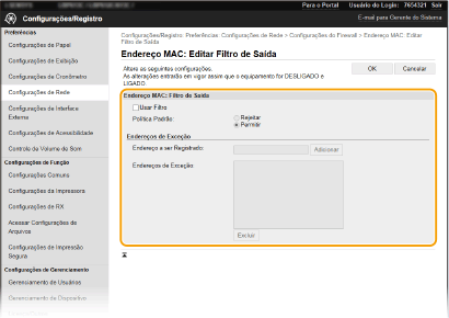 Se os endereços MAC não forem introduzidos corretamente, pode não conseguir aceder à máquina a partir da UI Remota; nesse caso, será necessário definir <Filtro de Endereço MAC> para <Desativ.>. <Filtro de Endereço MAC>