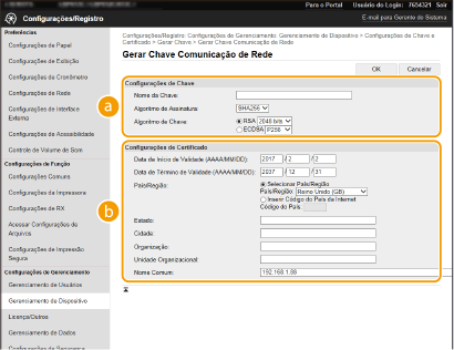 Se selecionar [SHA384] ou [SHA512] em [Algoritmo de Assinatura], não é possível selecionar [512 bits] como comprimento da chave quando seleciona [RSA] em [Algoritmo de Chave].