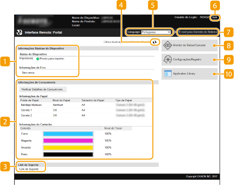 Quando inicia sessão na UI Remota, aparece a seguinte página do portal. Esta secção descreve os itens apresentados na página do portal e as operações básicas.