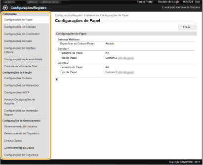 Pode alterar as diferentes definições da máquina utilizando a UI Remota. A maioria das definições também pode ser configurada na máquina, mas algumas definições só podem ser configuradas utilizando a UI Remota. Esta secção descreve o fluxo básico de alteração das definições da máquina utilizando a UI Remota.