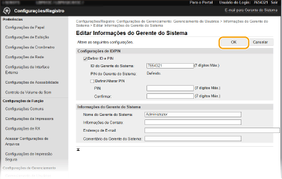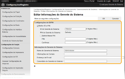 Algumas definições só podem ser alteradas depois de iniciar sessão no modo de administrador do sistema.