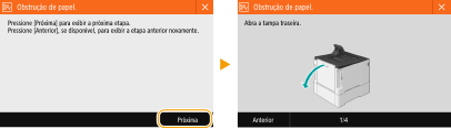 Em alguns casos, quando ocorre um erro, aparecem instruções para lidar com o erro. Siga as instruções no ecrã para resolver o problema. O ecrã apresentado quando ocorre um encravamento de papel é mostrado abaixo como exemplo.