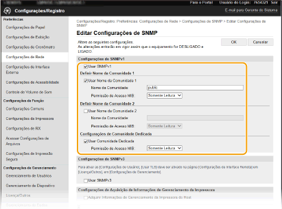 Se o SNMPv1 estiver desativado, algumas funções da máquina ficam indisponíveis (por exemplo, a obtenção de informações da máquina através do controlador de impressora).