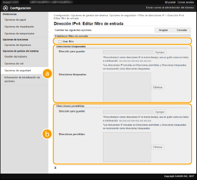2 | Especifique la dirección. Introduzca la dirección IP (o el rango de direcciones IP) en el cuadro de texto [Dirección para guardar] y haga clic en [Agregar]. Dirección registrada | Resultado | [Direcciones bloqueadas] | Restringe la comunicación (recibida) con dispositivos que tengan introducidas sus direcciones IP para [Dirección para guardar]. Se permitirá la comunicación con dispositivos con cualquier otra dirección IP. | [Direcciones permitidas] | Permite la comunicación (recibida) únicamente con dispositivos que tengan introducidas sus direcciones IP para [Dirección para guardar] y restringe la comunicación con dispositivos con cualquier otra dirección IP. | Registrada como ambas | Permite la comunicación (recibida) únicamente con dispositivos que tengan registradas sus direcciones IP en [Direcciones permitidas] y restringe la comunicación con dispositivos con cualquier otra dirección IP. Sin embargo, la comunicación estará restringida para las direcciones IP que estén registradas también en [Direcciones bloqueadas]. |