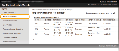 Si inició una sesión en el modo de administrador del sistema, se mostrará una lista de todos los documentos de impresión que se estén imprimiendo actualmente y en espera de impresión. Si introdujo su nombre de usuario al iniciar sesión en el modo de Usuario general, el nombre de usuario solo aparecerá en los documentos impresos. Haga clic en [Nº trabajo] en los documentos pausados para ver información detallada. Podrá consultar el nombre de usuario y el número de páginas del documento impreso. |