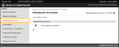 Cuando se produzca un error, esta página aparecerá haciendo clic en el mensaje que aparece debajo de [Información de errores] en la página del Portal (página principal).