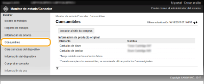 Se muestra información sobre consumibles, como puede ser el número de modelo de un cartucho. También podrá hacer clic en [Comprobar detalles de consumibles] en la página del Portal (página principal) para visualizar esta página (
