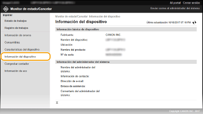 Se muestra la información sobre el equipo y el administrador del sistema. Esta información está establecida en [Gestión del sistema] en la página [Configuración].