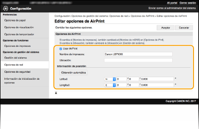 Puede registrar la información, incluido el nombre del equipo y la ubicación de instalación, que se utilice para identificar el equipo. Asimismo, puede deshabilitar la función AirPrint del equipo. Utilice la IU remota para cambiar estas opciones.