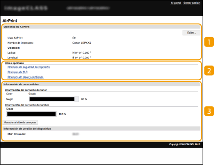 Puede visualizar la pantalla para AirPrint, en la que, además de acceder a las opciones de AirPrint, puede ver la información sobre los consumibles, como los cartuchos de tóner, etc. Además, puede configurar las opciones de las funciones de seguridad.