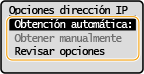 3 | Compruebe que <IP automática> esté establecido en <On>. Si está seleccionado <Off>, cambie la opción a <On>. |