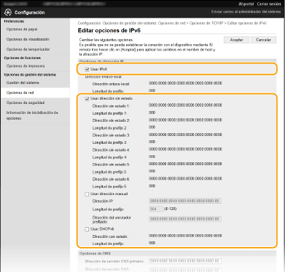 Dirección manual | Dirección que se introduce manualmente. Cuando utilice esta dirección, especifique la longitud del prefijo y la dirección del router predeterminada. |