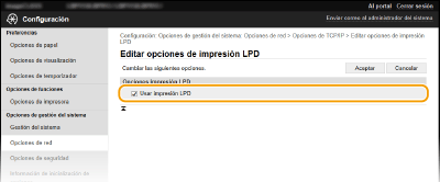 2 | Configure las opciones según sus necesidades. ![]() [Usar impresión LPD] Seleccione la casilla de verificación para imprimir a través de LPD. Cuando no utilice la impresión LPD, quite la marca de la casilla de verificación. [Usar impresión RAW] Seleccione la casilla de verificación para imprimir a través de RAW. Cuando no utilice la impresión RAW, quite la marca de la casilla de verificación. |