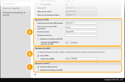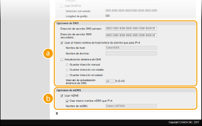 2 | Configure las opciones de DNS IPv4. ![]() [Opciones de DNS][Dirección de servidor DNS primario] Introduzca la dirección IP de un servidor DNS. [Dirección de servidor DNS secundario] Introduzca la dirección IP de un servidor DNS secundario, si existe. [Nombre de host] Introduzca caracteres alfanuméricos en el nombre de host del equipo que vaya a registrar en el servidor DNS. [Nombre de dominio] Introduzca caracteres alfanuméricos en el nombre del dominio al que pertenezca el equipo, como "example.com". [Actualización dinámica de DNS] Seleccione la casilla de verificación para actualizar dinámicamente los registros DNS cuando cambie la dirección IP del equipo. Cuando especifique el intervalo entre las actualizaciones, introduzca el tiempo en horas en el cuadro de texto [Intervalo de actualización dinámica de DNS]. [Opciones de mDNS][Usar mDNS] Adoptado por Bonjour, mDNS (DNS multidifusión) es un protocolo para relacionar un nombre de host con una dirección IP sin utilizar DNS. Seleccione la casilla de verificación para activar mDNS e introduzca el nombre de mDNS en el cuadro de texto [Nombre de mDNS]. [Opciones de DHCP][Obtener nombre de host] Seleccione la casilla de verificación para habilitar la Opción 12 y obtener el nombre de host del servidor DHCP. [Actualización dinámica de DNS] Seleccione la casilla de verificación para habilitar la Opción 81 y actualizar dinámicamente los registros DNS a través del servidor DHCP. |