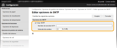 Seleccione la casilla de verificación [Usar SNTP] y especifique las opciones necesarias.