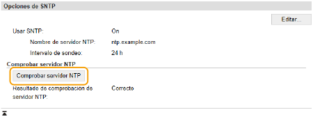 Podrá visualizar el estado de comunicación con el servidor registrado haciendo clic en [Configuración]  [Opciones de red]  [Opciones de TCP/IP]  [Comprobar servidor NTP] en [Opciones de SNTP]. Si se ha establecido correctamente una conexión, el resultado se mostrará como se indica abajo. Tenga en cuenta que esta operación no ajusta el reloj del sistema.