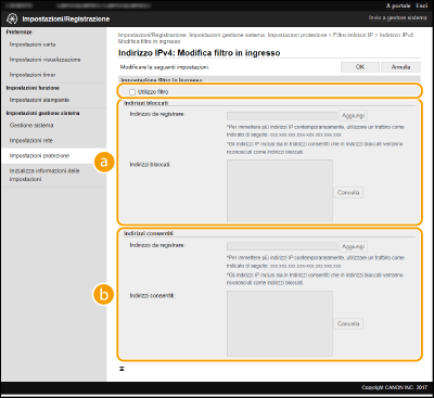 Se gli indirizzi IP sono immessi in modo non corretto, potrebbe non essere possibile accedere alla macchina dalla IU remota, in questo caso è necessario impostare <Filtro indirizzi IPv4> o <Filtro indirizzi IPv6> su <Off>. <Filtro indirizzi IPv4> <Filtro indirizzi IPv6>
