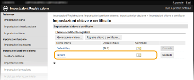 Non è possibile eliminare una chiave e un certificato se questi vengono attualmente utilizzati per un determinato scopo, ad esempio quando "[TLS]" è visualizzato sotto [Utilizzo chiave]. In questo caso, disabilitare la funzione o sostituire la chiave e certificato prima dell'eliminazione.