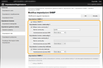È inoltre possibile specificare le impostazioni SNMPv1 e abilitare/disabilitare le impostazioni SNMPv3 dalla schermata <Menu>. <Impostazioni SNMP>