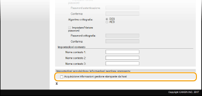 Selezionare la casella di controllo per abilitare il monitoraggio delle informazioni di gestione stampante della macchina tramite SNMP. Per disabilitare il monitoraggio delle informazioni di gestione della stampante deselezionare la casella di controllo.