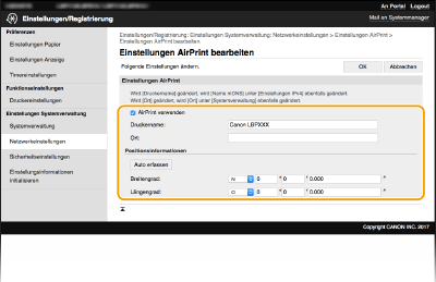 Sie können Informationen, mit denen das Gerät identifiziert wird, beispielsweise den Namen des Geräts und den Aufstellort, speichern. Sie können die AirPrint-Funktion des Geräts auch deaktivieren. Ändern Sie diese Einstellungen mit Remote UI.