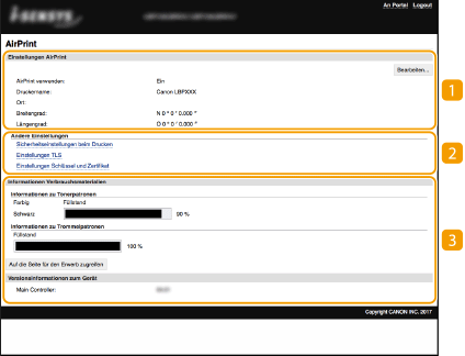 Rufen Sie den Bildschirm für AirPrint auf, auf dem Sie nicht nur auf die AirPrint-Einstellungen zugreifen, sondern auch Informationen zu Verbrauchsmaterial wie Tonerpatronen usw. anzeigen können. Darüber hinaus können Sie die Einstellungen der Sicherheitsfunktion konfigurieren.