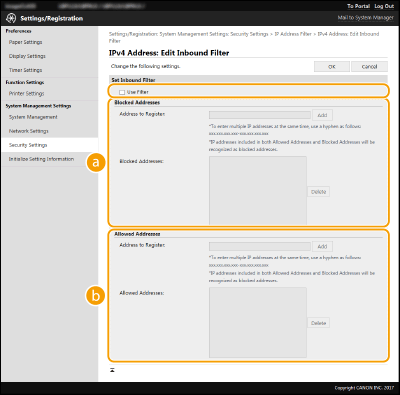 إذا تم إدخال عناوين IP بشكل غير صحيح، قد لا تتمكن من الوصول إلى الجهاز من واجهة المستخدم عن بعد Remote UI، في هذه الحالة تحتاج إلى ضبط <عامل تصفية عنوان IPv4> أو <عامل تصفية عنوان IPv6> على <إيقاف>.