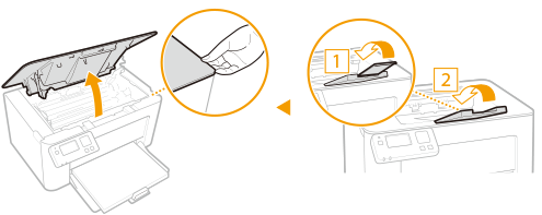 اغلق مصد الورق، ثم افتح غطاء مسحوق الحبر.