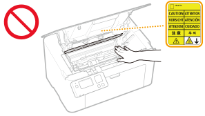 ) داخل الجهاز. والقيام بذلك قد يؤدي إلى تلف الجهاز.![]() لمنع انحشار الورق، لا تقم بإيقاف تشغيل الطاقة ولا تفتح/تغلق الأغطية، ولا تقم بتحميل/تفريغ الورق أثناء الطباعة.