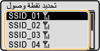 يمكنك البحث عن الموجهات اللاسلكية (أو نقاط الوصول) المتاحة للاتصال وتحديد واحد منها من شاشة الجهاز. فيما يتعلق بمفتاح الشبكة، أدخل مفتاح WEP أو PSK. قبل تحديد موجه لاسلكي، تحقق من معلومات الإعداد المطلوبة وقم بتدوينها، بما في ذلك مفتاح SSID ومفتاح الشبكة (التحقق من SSID ومفتاح الشبكة).