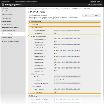 يمكن تكوين عناوين IPv6 الخاصة بالجهاز من خلال واجهة المستخدم عن بُعد Remote UI. وقبل تعيين عناوين IPv6، تحقق من صحة إعدادات عناوين IPv4 (مشاهدة إعدادات IPv4). ويلزم تعيين إعدادات IPv4 الصحيحة لاستخدام عناوين IPv6. ويمكن أن يستخدم الجهاز عناوين IPv6 المتعددة التالية: