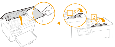اغلق مصد الورق، ثم افتح غطاء مسحوق الحبر.