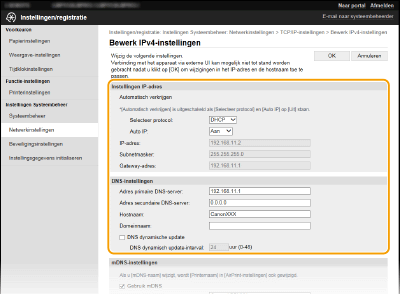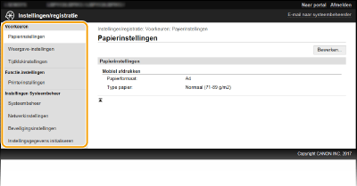 U kunt verschillende instellingen van het apparaat wijzigen met de externe UI. De meeste instellingen kunnen ook via het bedieningspaneel van het apparaat worden gewijzigd, maar sommige instellingen kunt u alleen wijzigen via de externe UI. Dit gedeelte beschrijft de basisprocedure voor het veranderen van de instelling van het apparaat met behulp van de externe UI.
