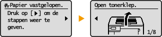 In sommige gevallen worden, wanneer er een fout optreedt, instructies weergegeven over hoe u moet reageren. Volg de aanwijzingen op het scherm voor het oplossen van het probleem. Het scherm dat wordt weergegeven wanneer er zich een papierstoring voordoet, wordt hieronder getoond als voorbeeld.