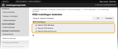 Schakel dit selectievakje in om via WSD informatie over het apparaat op te halen van een computer. Dit selectievakje wordt automatisch ingeschakeld wanneer u het selectievakje [Gebruik WSD-afdrukken] inschakelt. [Gebruik Multicast Discovery]