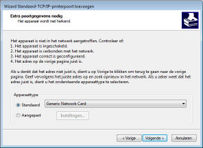 Dit is een standaard Windows poort. Als u dit type poort gebruikt, moet u iedere keer als het IP-adres van het apparaat is veranderd een nieuwe poort toevoegen. Selecteer dit type poort als u het apparaat in een IPv6 omgeving gebruikt en u geen MFNP poort kunt toevoegen.