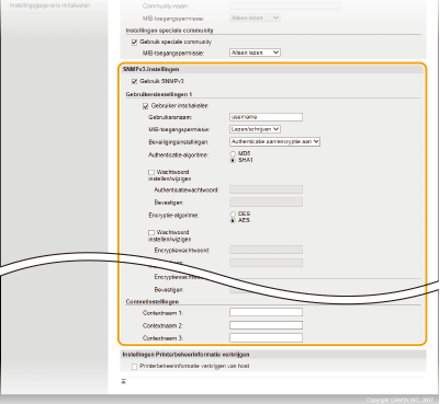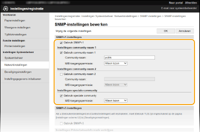 SNMP (Simple Network Management Protocol) is een protocol voor het bewaken en aansturen van communicatieapparaten in een netwerk dat werkt met MIB (Management Information Base). De machine ondersteunt SNMPv1, en SNMPv3 met extra beveiliging. U kunt de status van de machine controleren vanaf een computer wanneer u documenten afdrukt of de externe UI gebruikt. U kunt SNMPv1 of SNMPv3 inschakelen, of beide versies tegelijk. Geef voor elke versie de instellingen op die aansluiten bij de inrichting en functie van uw netwerkomgeving.