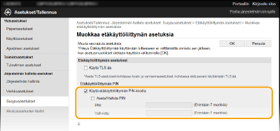 ![]() Käyttöpaneelin käyttäminenEtäkäyttöliittymän PIN-asetuksia voidaan käyttää myös <Valikko>-kohdassa Koti -näytössä. <Etäkäyttöliittymän asetukset>