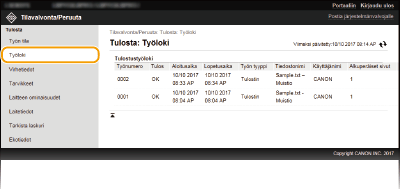 Valitse pysäytetyn asiakirjan [Työnumero], jos haluat nähdä tarkat tiedot. Voit tarkistaa tulostetun asiakirjan käyttäjänimen ja sivumäärän.
