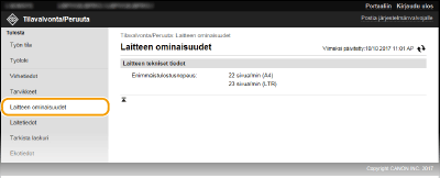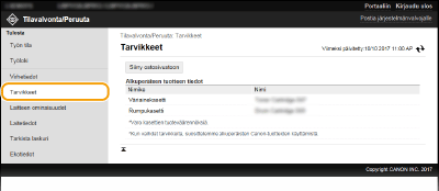 Tarvikkeiden tiedot, kuten kasetin mallinumero, näytetään. Voit myös napsauttaa [Tarkista tarvikkeiden tiedot] portaalisivulla (pääsivulla) näyttääksesi tämän sivun (