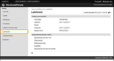 Tiedot laitteesta ja järjestelmänvalvojasta näytetään. Nämä tiedot asetetaan [Järjestelmän hallinta] -kohdassa [Asetukset/Tallennus]-sivulla.