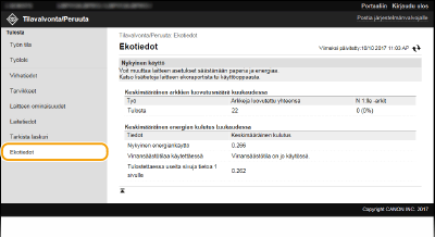 Voit tarkistaa tiedot, kuten tulosteiden määrän kuukaudessa ja kulutetun virran määrän.